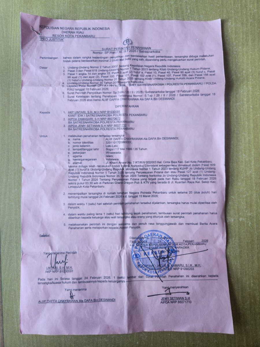 Dalam kronologi yang diterima GRANAT, dua orang berinisial AF dan AN disebut sebagai pihak yang memesan barang melalui seseorang berinisial AL. Sementara itu, seorang berinisial WC diketahui merupakan supervisor di salah satu tempat hiburan malam di kawasan Jalan Jenderal Sudirman, Pekanbaru. Barang yang diduga narkotika tersebut disebut berasal dari seseorang berinisial TR.